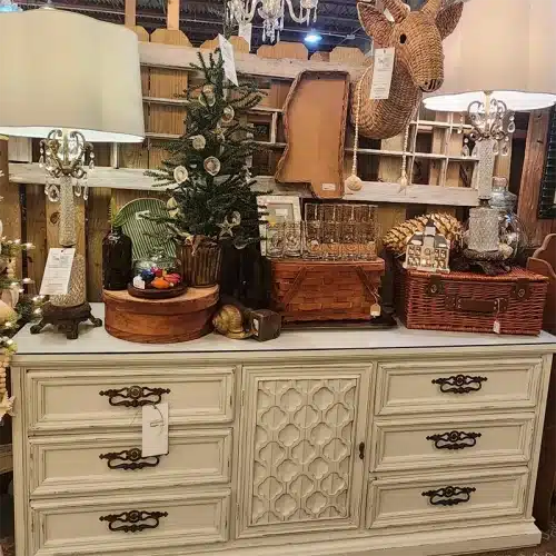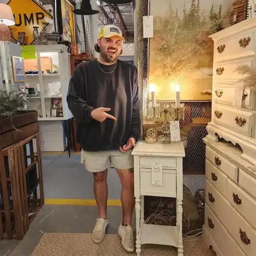 For the past four years, Hunter Lizana has brought exceptional style and creativity to Vintage Flamingo. As both a valued vendor and employee, he’s known for his remarkable eye for staging and design. Hunter sources unique pieces from as far away as Round Top, Texas, to right here on the Coast, curating a blend of character, charm, and coastal flair. His beautifully styled booth, The Lucky Crane, is a must-see inside Vintage Flamingo.